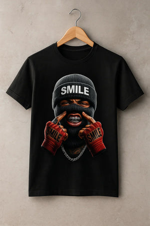 Turn heads and break the silence with the "SMILE" Graphic Tee — where street rebellion meets art. This bold design features a masked figure flashing silver grillz, gloved hands pulling down the balaclava, and the word “SMILE” stitched across the forehead — all packed into one jaw-dropping visual that commands attention.
